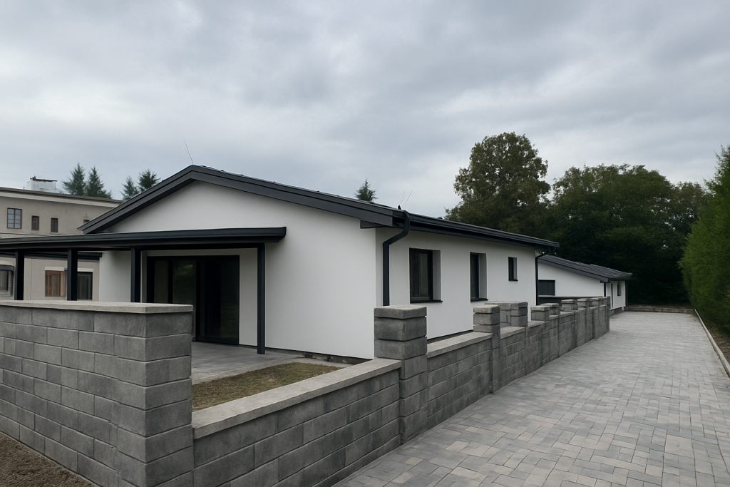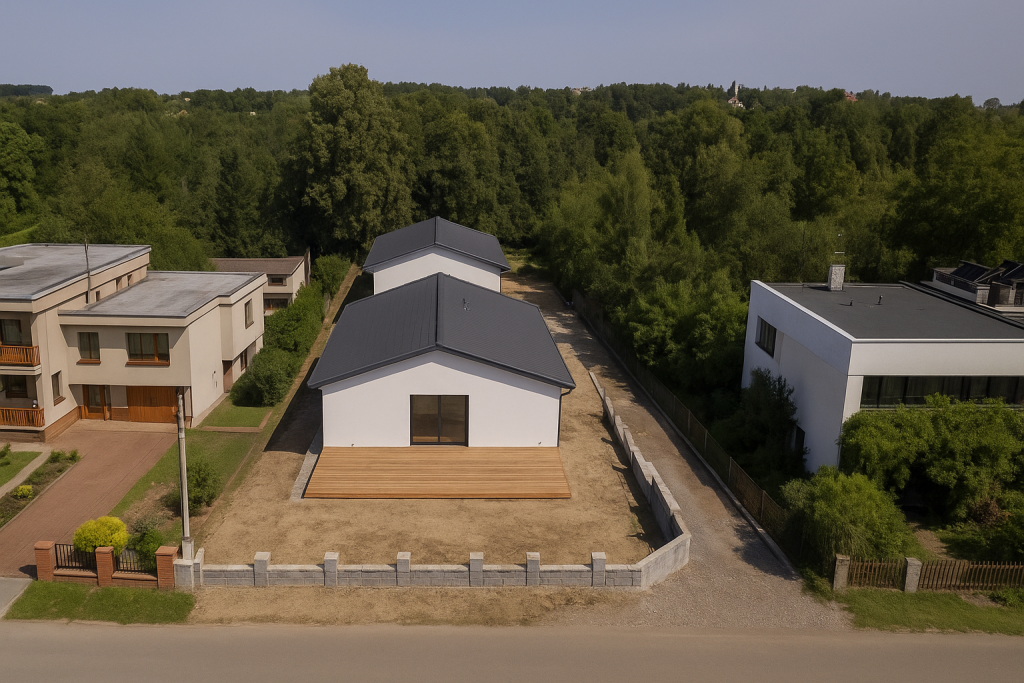 Připravili jsme proto studii změny stavby před dokončením, ve které jsme upravili jak dispoziční, tak architektonické řešení. Z původně složitějšího tvaru zastřešení vznikly jednoduché obdélné domy se sedlovými střechami, které působí čistěji a elegantněji. Nová dispozice umožnila vznik druhé koupelny a šatny navazující na ložnici, čímž jsme zvýšili komfort a soukromí obyvatel. Hlavní obytný prostor jsme otevřeli do prostorného obývacího pokoje s kuchyní, který plynule přechází do exteriéru díky kryté terase. Součástí obou domů je také stání pro dva automobily. Výsledkem je moderní, funkční a promyšlené bydlení, které odpovídá představám investora i současným nárokům na rodinný dům.